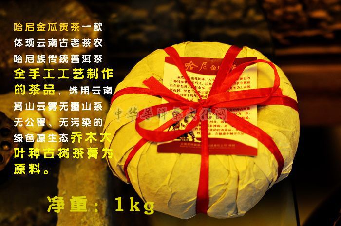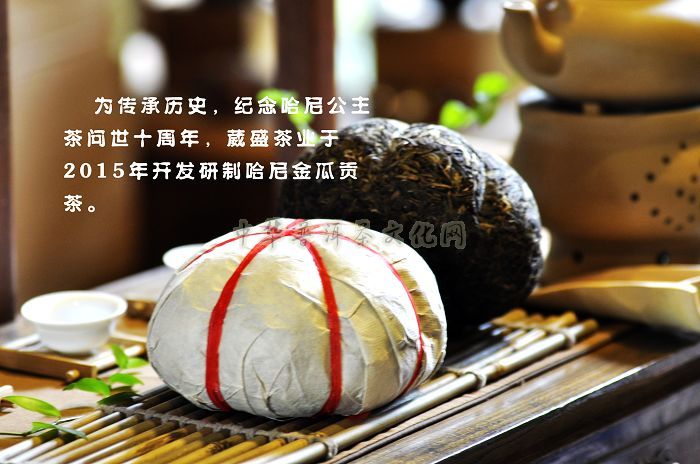 为传承历史,纪念哈尼公主茶问世十周年,葳盛茶业于2015年开发研制哈尼金瓜贡茶,这是一款体现云南古老茶农哈尼族传统普洱茶全手工工艺制作的茶品,选用云南高山云雾无量山系无公害、无污染的绿色原生态乔木大叶种古树茶菁为原料,集历史文化与民族文化为一体。