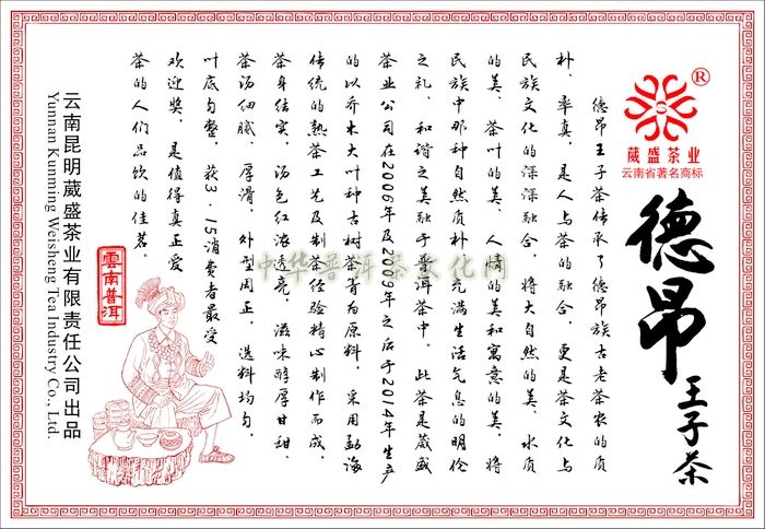 德昂王子茶传承了德昂族古老茶农的质朴、率真,是人与茶的融合,更是茶文化与民族文化的深深融合,将大自然的美、水质的美、茶叶的美、人情的美和寓意的美,将民族中那种自然质朴、充满生活气息的明伦之礼、和谐之美融于普洱茶中。此茶是葳盛茶业公司在2006年及2009年之后于2014年生产的以乔木大叶种古树茶箐为原料,采用勐海传统的熟茶工艺及制茶经验精心制作而成,茶身结实,汤色红浓透亮,滋味醇厚甘甜、茶汤细腻、厚滑,外型周正,选料均匀,叶底匀整,获3•15消费者最受欢迎奖,是值得真正爱茶的人们品饮的佳茗。 公司网站:中华普洱茶文化网 公司网址:http://www.zhpecwh.cn 公司地址:云南省昆明市官渡区关上宝海路163号 联系电话: 0871—63559399 400—0977—357 在线QQ联系:348058891 564855862