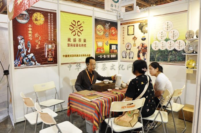 云南昆明葳盛茶业有限责任公司董事长张明春先生(主席台左二)现场引领嘉宾品饮普洱茶与葡萄酒