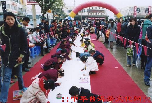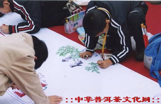 这次参赛的儿童分为两个组,大组由7-10岁儿童组成,小组由5-7岁儿童组成,在300多米长的巨型布标上,每个儿童分到了约50-60公分的一块作为自己绘画创作的天地。这些小画家把茶山、茶树、茶品与大自然和人有机地结合在一起。包容了茶文化的丰富内容,显得十分天真、活泼、浪漫、稚雅,富有旺盛生机。经昆明市、官渡区美术家协会专家评比,有50多名儿童分别获得了一、二、三等奖及优秀奖,同时在现场颁发了奖品。此次活动还组织了以家庭为单位的茶文化知识竞赛,人们争先恐后,抢答气氛极为热烈,最后评出了一、二、三等奖。优胜者分别获得了葳盛茶业公司提供的优质普洱茶。通过这次活动,弘扬了茶文化,使茶文化渗透到市民家庭,在儿童幼小的心灵上播撒上了茶的种子。活动结束时,参赛儿童分享了用普洱茶汤制作的10层大蛋糕,把茶叶的芬芳留在了儿童心田。