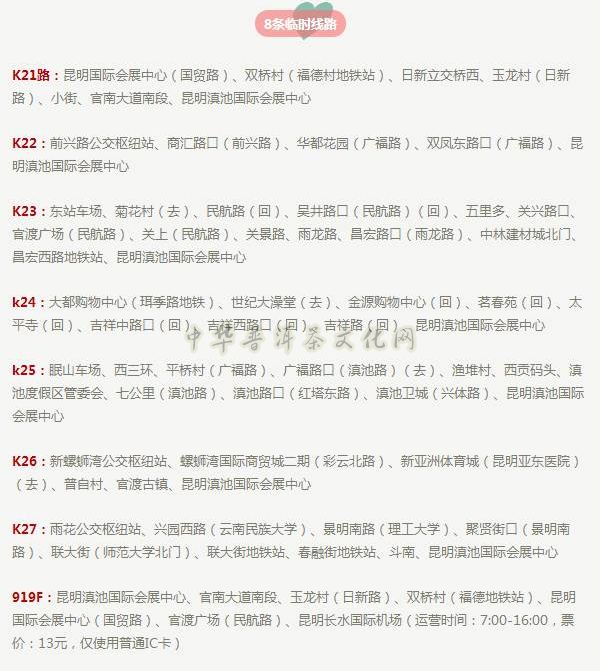 展会期间,公交将临时开行8条摆渡线、8条公交专线以及15条定制直达公交专线,福保路、湖滨路、前兴路、巫家坝路(原飞虎大道)、昌宏西路、珥季路、海埂会堂,这7个站点市民可乘摆渡车进入会展中心区域逛展。会展中心外环也有一条摆渡环线,单向循环绕场馆外环线运行。