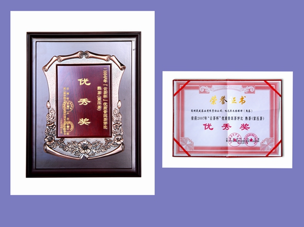 2007年10月份葳盛茶业的“哈尼乔木陈醇饼”在【云茶杯】优质普洱茶评比熟茶(紧压茶)活动中被评为优秀奖