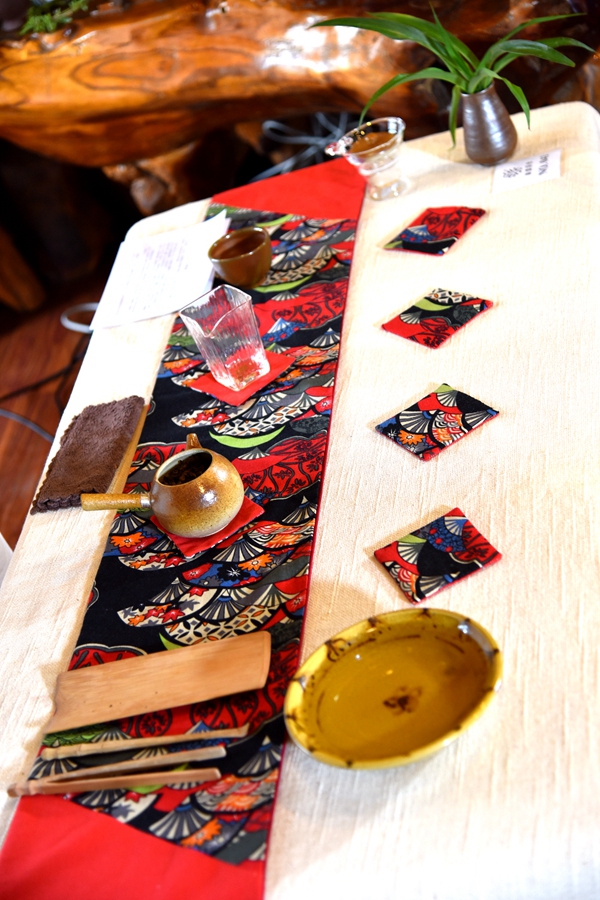 整个茶席采用了中式、日式两种元素融合在一起。茶席上的桌旗,杯垫大量使用红色,红色是中国人自古至今都崇尚的颜色,红色是生存之火与生命的颜色,是吉祥之色。茶席的主体图案是一个扇面的纹样。扇面纹,在中国传统文化中,是吉祥的纹样,扇通善,善行——美好的品行;美好的行为。在《礼记·曲礼上》:“博闻强识而让,敦善行而不怠,谓之君子”。同样,在日本,扇面纹也是一个传统的纹饰,使用较多的纹饰。