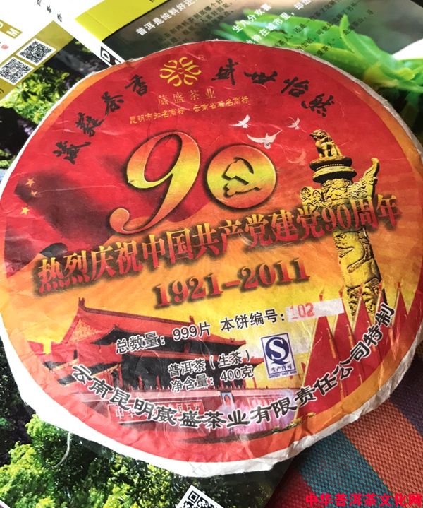在喜贺中国共产党90岁生日的同时,昆明葳盛茶业有限责任公司荣获昆明市知名商标、云南省著名商标,在这意义深远的历史时刻,为弘扬普洱茶文化,提升普洱茶品味,推动普洱茶市场的良性发展,特别开发、研制建党90周年纪念茶,向中国共产党90岁生日献礼。90周年纪念普洱茶至今已有6岁啦,在以后的日子里,它将始终如一地伴随着党的成长,见证党的光辉历程。