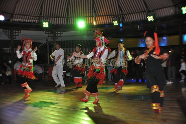 彝族小伙姑娘们合着欢快的音乐跳起传统的舞蹈