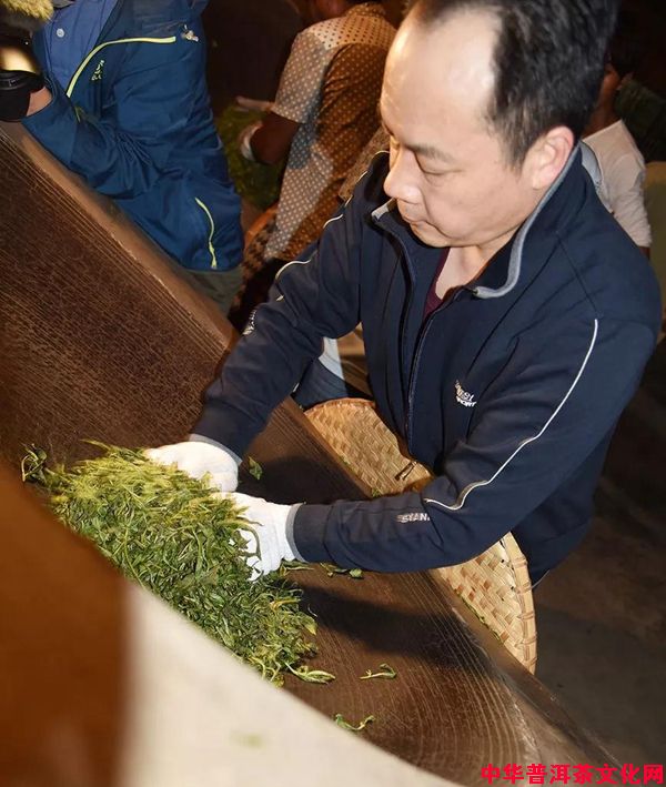 制茶匠人、国家级高级制茶工程师张明春先生选取了23号茶树的鲜叶开始杀青,杀青是制茶过程中最为重要的一个过程之一,所谓一人一味,在这个过程中每个师傅的杀青手法也决定了茶的口感。